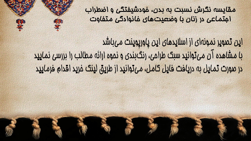 پاورپوینت مقایسه نگرش نسبت به بدن، خودشیفتگی و اضطراب اجتماعی در زنان با وضعیتهای خانوادگی متفاوت