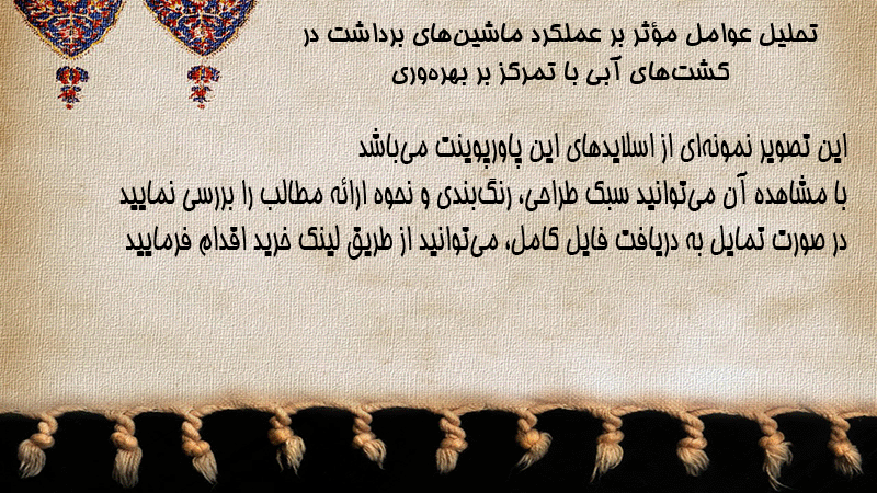 پاورپوینت تحلیل عوامل مؤثر بر عملکرد ماشینهای برداشت در کشتهای آبی با تمرکز بر بهرهوری