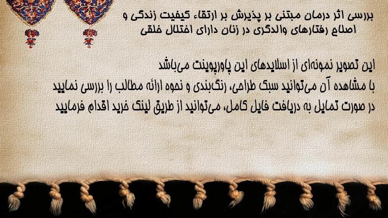 پاورپوینت بررسی اثر درمان مبتنی بر پذیرش بر ارتقاء کیفیت زندگی و اصلاح رفتارهای والدگری در زنان دارای اختلال خلقی