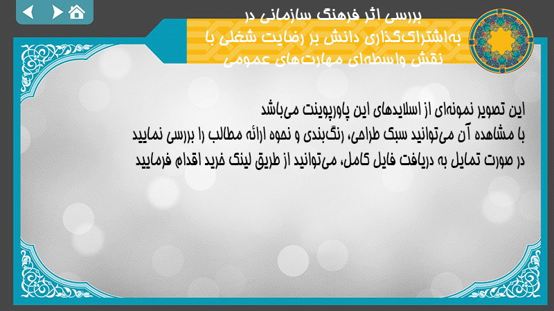 پاورپوینت بررسی اثر فرهنگ سازمانی در بهاشتراکگذاری دانش بر رضایت شغلی با نقش واسطهای مهارتهای عمومی
