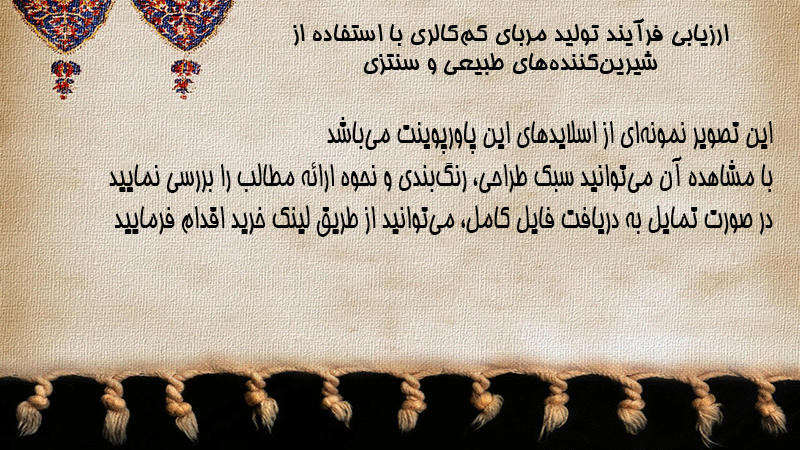 پاورپوینت ارزیابی فرآیند تولید مربای کمکالری با استفاده از شیرینکنندههای طبیعی و سنتزی