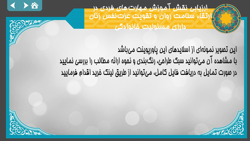 پاورپوینت ارزیابی نقش آموزش مهارتهای فردی در ارتقاء سلامت روان و تقویت عزتنفس زنان دارای مسئولیت خانوادگی