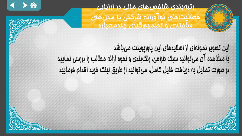 پاورپوینت رتبهبندی شاخصهای مالی در ارزیابی فعالیتهای نوآورانه شرکتی با مدلهای ساختاری و تصمیمگیری چندمعیاره