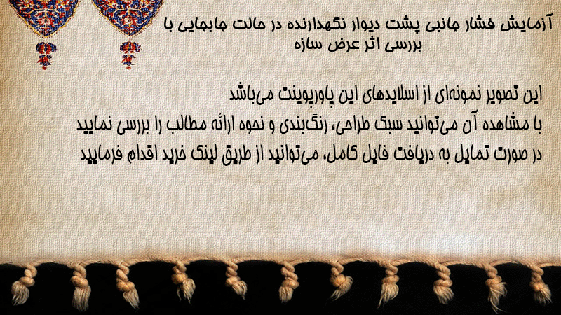 پاورپوینت آزمایش فشار جانبی پشت دیوار نگهدارنده در حالت جابجایی با بررسی اثر عرض سازه