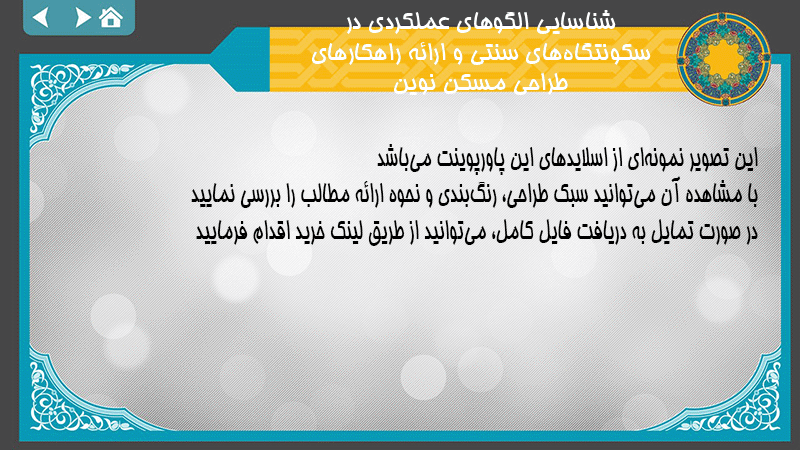 پاورپوینت شناسایی الگوهای عملکردی در سکونتگاههای سنتی و ارائه راهکارهای طراحی مسکن نوین