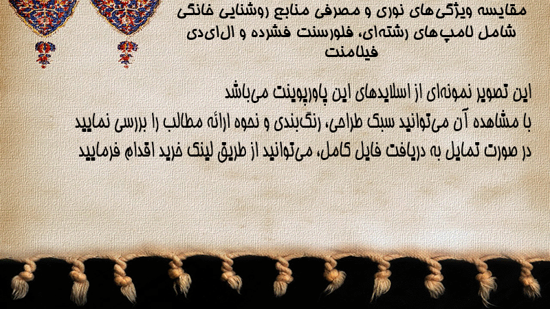 پاورپوینت مقایسه ویژگیهای نوری و مصرفی منابع روشنایی خانگی شامل لامپهای رشتهای، فلورسنت فشرده و الایدی فیلامنت
