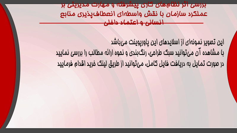 پاورپوینت بررسی اثر نظامهای کاری پیشرفته و مهارت مدیریتی بر عملکرد سازمان با نقش واسطهای انعطافپذیری منابع انسانی و اعتماد داخلی