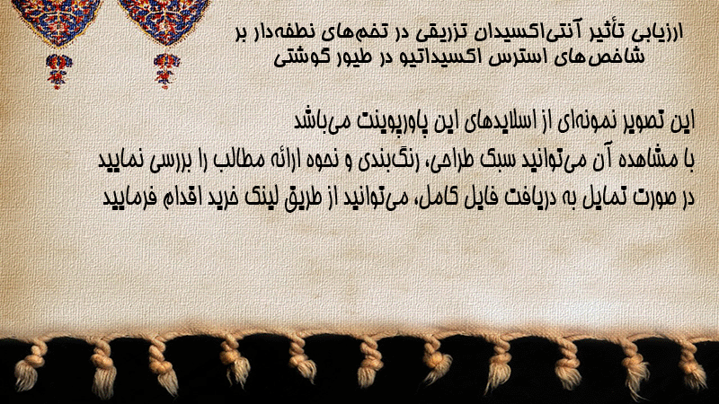 پاورپوینت ارزیابی تأثیر آنتیاکسیدان تزریقی در تخمهای نطفهدار بر شاخصهای استرس اکسیداتیو در طیور گوشتی
