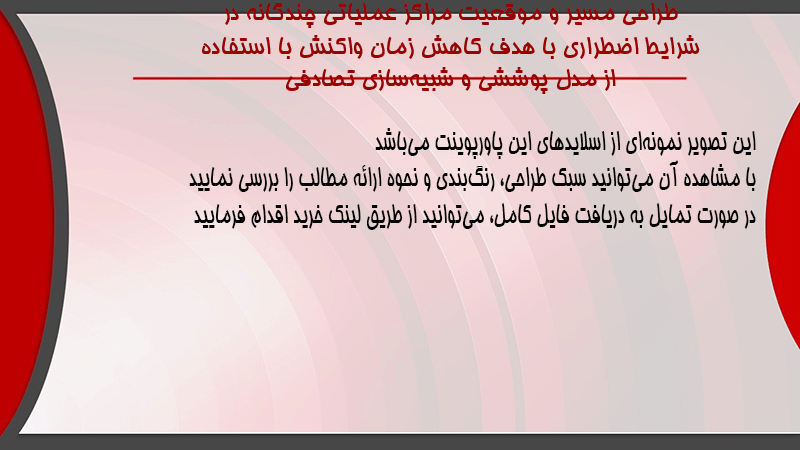 پاورپوینت طراحی مسیر و موقعیت مراکز عملیاتی چندگانه در شرایط اضطراری با هدف کاهش زمان واکنش با استفاده از مدل پوششی و شبیهسازی تصادفی